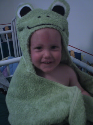 You can't see it that great.... but Jacob took two identical falls today and did a number on his head! He LOVES to play outside, but that proves to be dangerous for him.. He hit the middle of his forhead on the sidewalk SOOO hard twice, and has a HUGE bruise and "blood marks" to prove he is tough. :( But, he looks really cute in his frog towel..... :)